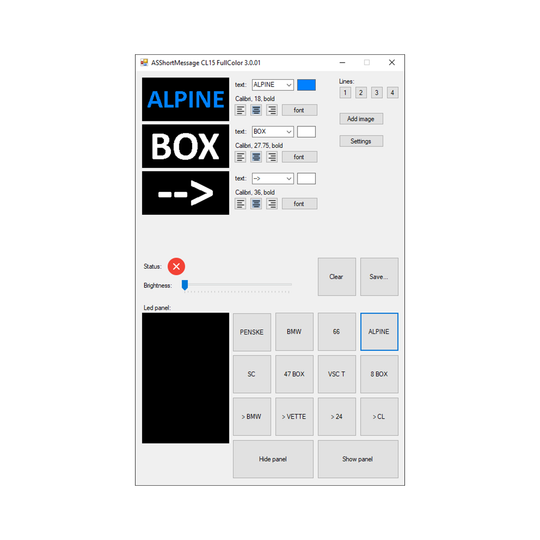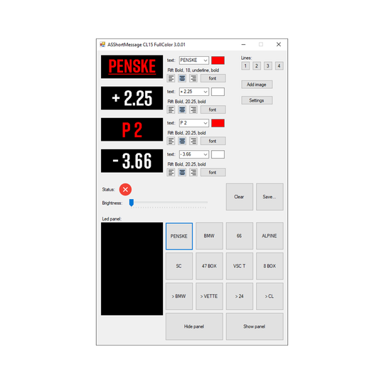 PIT BOARD CL-15. New full-color and graphic technology. Standard LED fonts can be projected in 1,2,3 or 4 rows. Possibility of inserting graphic files depicting logos, signals, instructions, symbols, etc. CL-15 includes standard software for Windows...Please sign in to see pricingRegular price From €4.950,00Regular price From €4.950,00Excl. tax: €4090.91 -