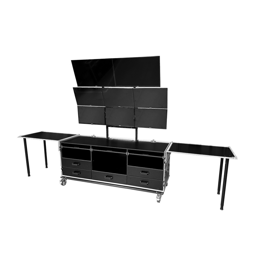 With five pull-out drawers, three sliding work surfaces, and optional attachable side tables, it provides versatile workspace solutions. Compact and transport-ready, all monitors, extensions, and accessories fit securely inside the case for easy deployment.