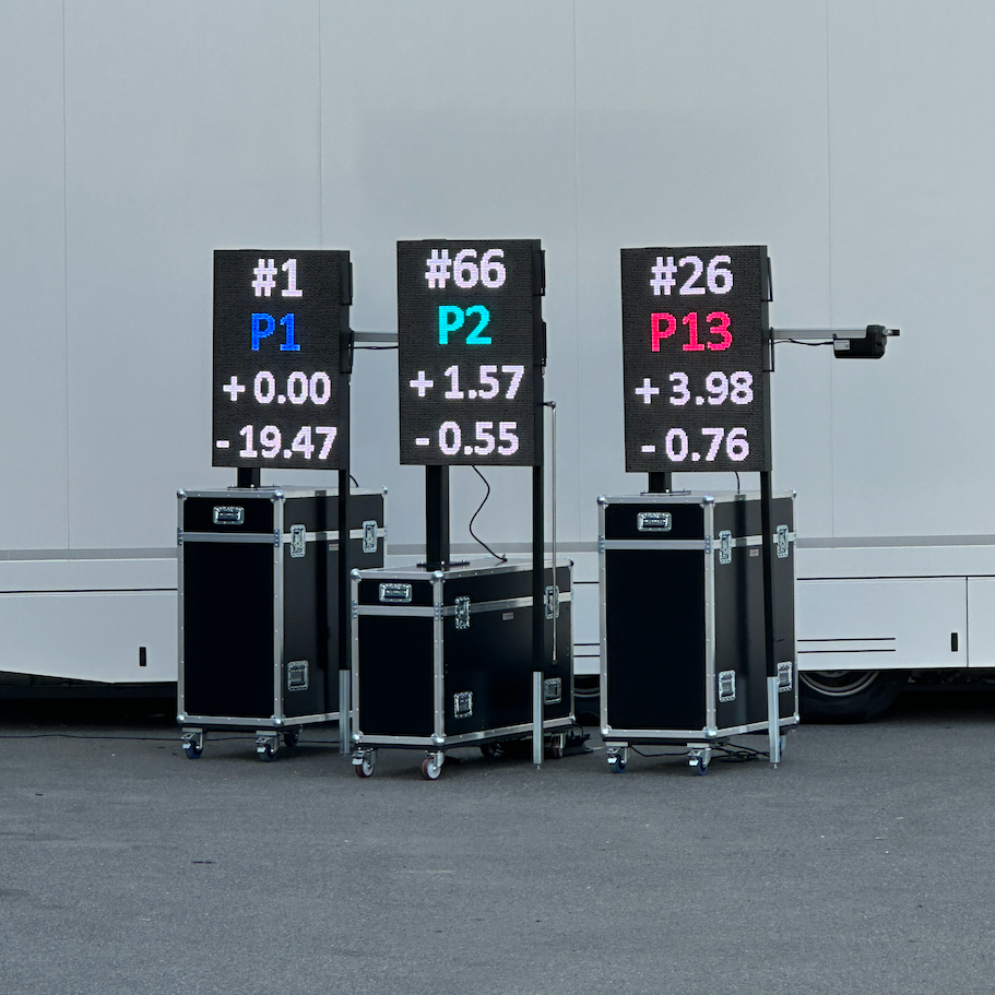 Highly weatherproof IP65, sophisticated waterproof flight case for transport* and also as a support bracket for the pitwall. Light weight and compact dimensions. The post mount is universal for right or left-handed circuits. Intuitive SW for easy operation of the pit board. Memory pre-programmed buttons, font, size and color selections.