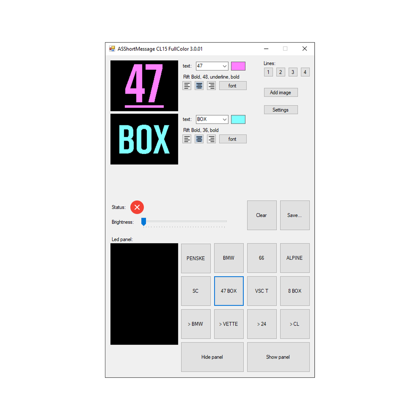 PIT BOARD CL-15. New full-color and graphic technology. Standard LED fonts can be projected in 1,2,3 or 4 rows. Possibility of inserting graphic files depicting logos, signals, instructions, symbols, etc. CL-15 includes standard software for Windows environment.