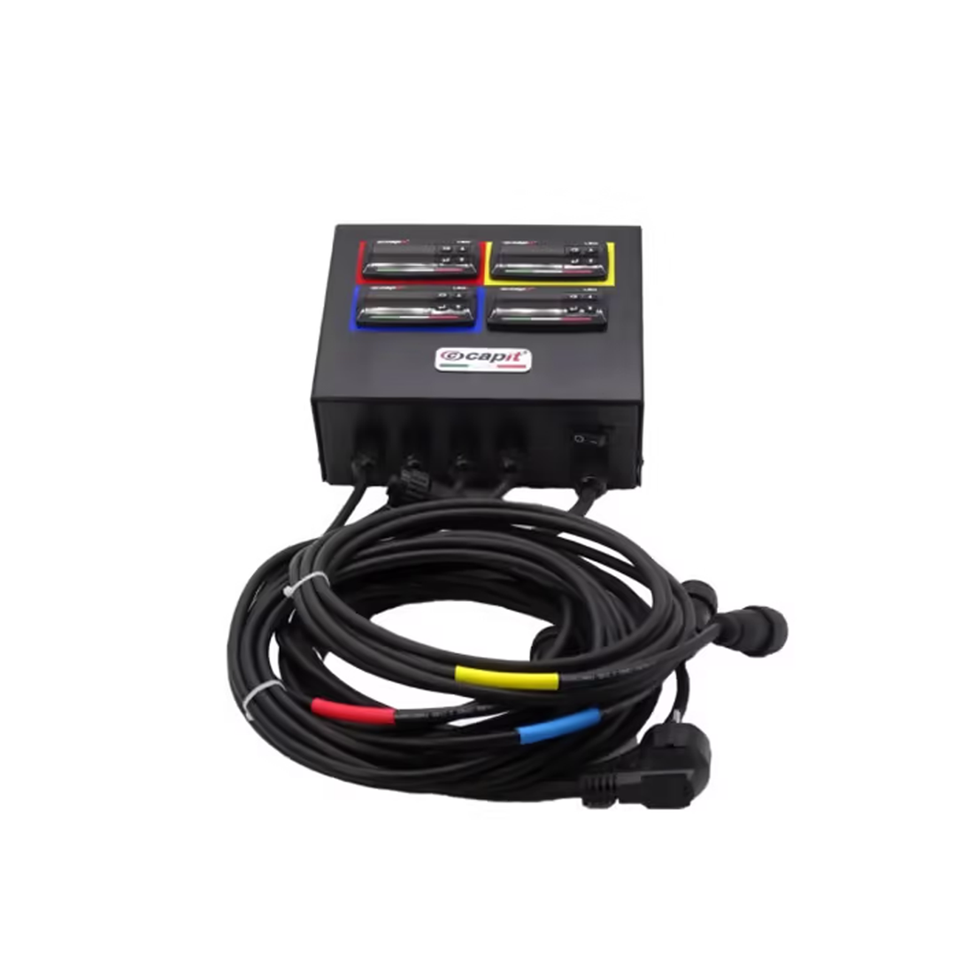 The Leo 4 Capit temperature control unit monitors and manages the temperature of a set of 4 tire warmers (PROFI). It allows you to set up to three different temperatures. Made of sturdy, shockproof aluminum, with non-slip feet on the back.