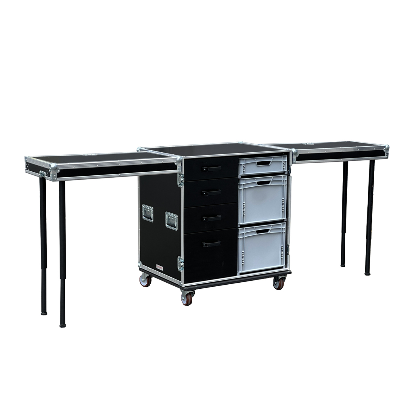 Universal combo set, pull-out tool drawers and EURO spare parts boxes. Complete with two side tables. Suitable for every team.